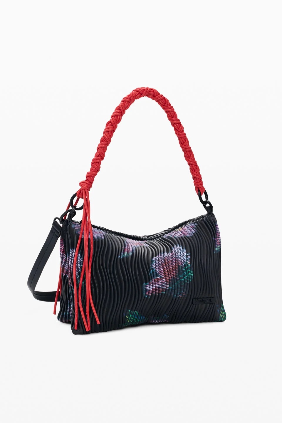Γυναικεία τσάντα ώμου με εντυπωσιακό πλισέ σχέδιο και καλλιτεχνικό πολύχρωμο print που δημιουργεί ένα μοντέρνο και ιδιαίτερο αποτέλεσμα. Το ξεχωριστό κόκκινο πλεκτό λουράκι προσθέτει δυναμική αντίθεση και δίνει μοναδικό χαρακτήρα στο σχέδιο.